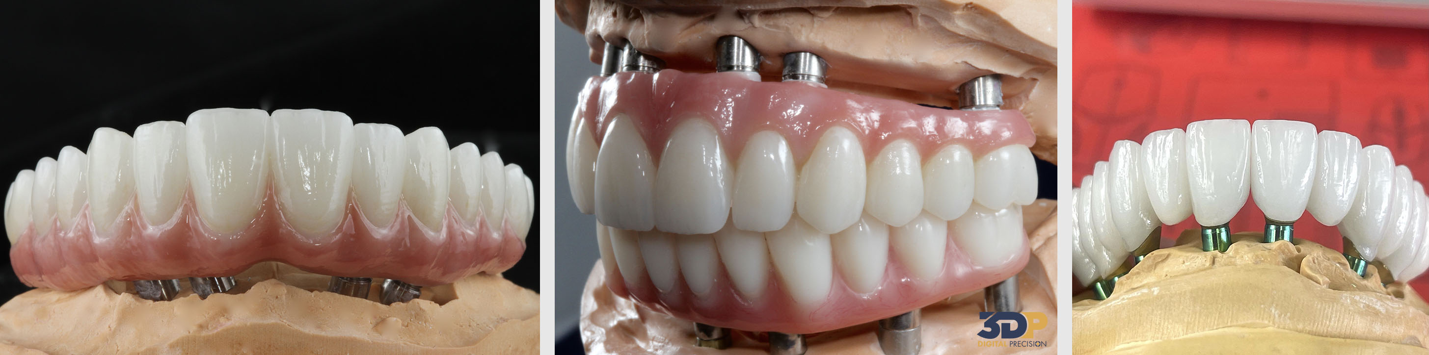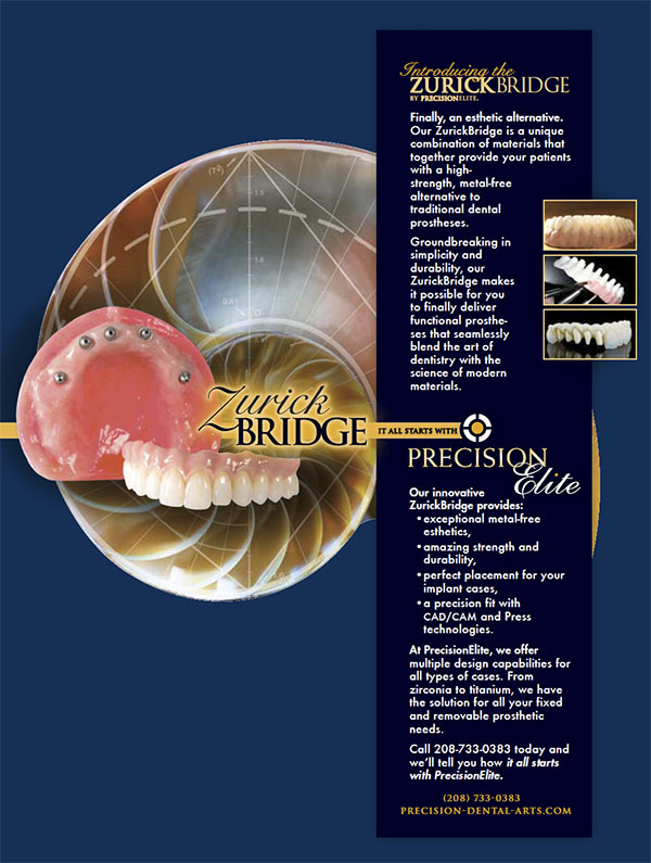Constructed from 100% solid zirconia, our Zurick Bridge Implant Prosthesis provides the same superior stability and function as the screw-retained hybrid denture, but with a monolithic construction that avoids the chips, stains and fractures that can compromise acrylic appliances. With superior fracture toughness and an average flexural strength of 1200 MPa, our Zurick Bridge with Ivoclar's Prime Zirconia is the ideal material for withstanding the functional stresses that full-arch restorations must endure. This material is also gentle to opposing dentition and hypoallergenic.